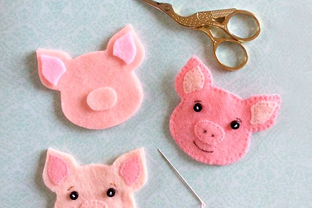 Из фетра вырезаем мордочку свинки и прошиваем по краям. В качестве глазок можно пришить пуговички или пришить бисер.