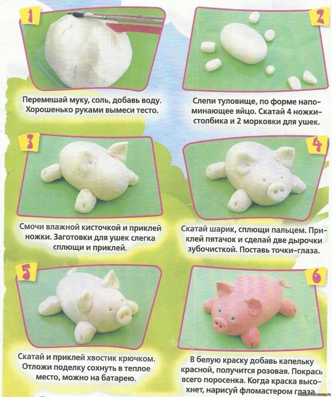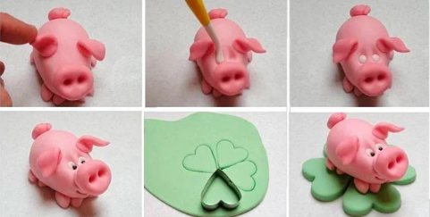 Понадобится пластилин розового цвета. Сначала делаем круги и прорезаем их с одной стороны зубочисткой или ножиком специальным для лепки. Это будут копытца. Затем лепим продолговатое тело и крепим его на копыта. Делаем уши, а в том месте, где у свиньи голова - немного надрезаем и вставляем туда ушки. Можно им немного придать форму, чтобы были похожи на настоящие. Теперь делаем пятачок и хвостик. Крепим их. Глазки делаются из белого и черного пластилина. Раскатываем зеленый пластилин и специальной формочкой вырезаем из него несколько сердечек, склеиваем их между собой и сверху сажаем нашу свинку. Поделка готова. Свинку можно сделать и из пластиковой бутылки. Подробный мой МК тут.