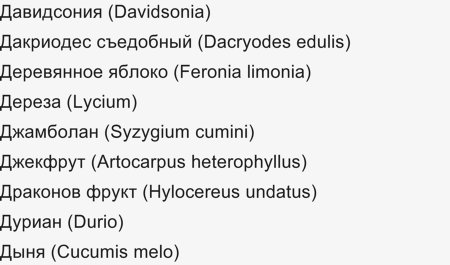 Из самых известных - это дыня, которую ели многие, и дуриан, известный своим вкусом и запахом. Также можно назвать джекфрут (индийское хлебное дерево), джамболан, дакриодес, джамбоза (розовое яблоко), джаботикабо (иногда в переводе пишут первую букву "ж"). Есть и похожие на сливы фрукты - давидсония.