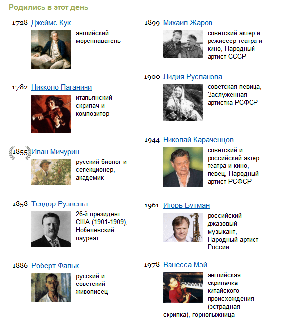 А вот у меня день рождения совпадает с днем рождения Ивана Урганта, Чарльза Чаплина, Эллен Баркин, Питера Устинова, Сергея Никоненко, Александра Семчева. Это я только актеров перечислила.