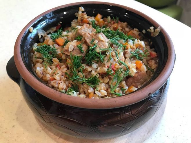 На дно горшочков кладём по кусочку сливочного масла, добавляем нашу смесь овощей и гречки. Заливаем кипятком чуть выше уровня гречки. Сверху кладём зубчики чеснока и кольца помидора.
