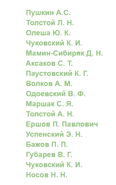 Среди других писателей-сказочников можно вспомнить такие фамилии, как Жуковский, Лев Толстой, Маршак, Носов, Одоевский,