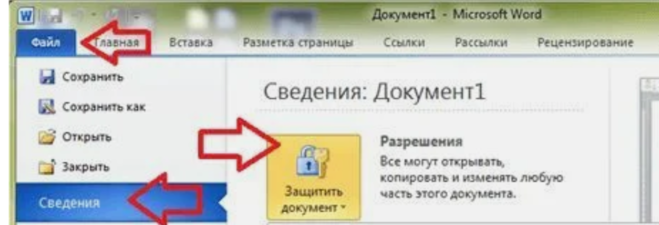 В меню "Файл" необходимо выбрать пункт "Сведения" и далее нажать на "Защитить документ".