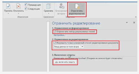 Заходим во вкладку Рецензирование далее в Ограничить редактирование, и ставим галочки в соответствующих полях . Включаем защиту.