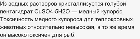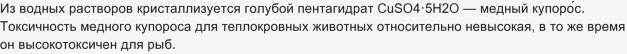 Следует добавить что медный купорос токсичен. Смертельная доза медного купороса составляет от 8 до 30 граммов для взрослого человека перорально (через рот).— 13 лет назад